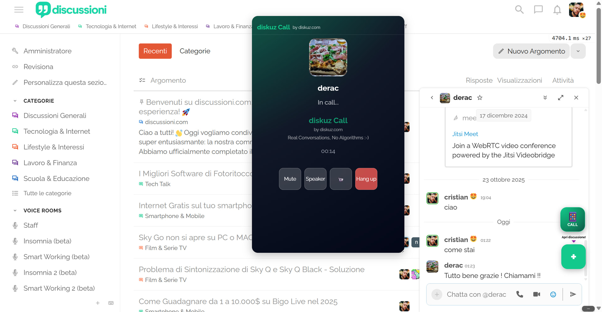 Su https://discussioni.com ho introdotto una nuova funzione chiamata diskuz Call, che permette agli utenti del forum di effettuare chiamate vocali e video direttamente dal browser.