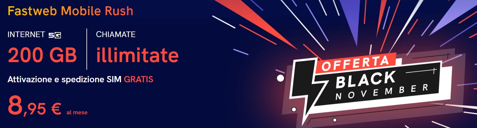 L’offerta Fastweb Mobile Rush 200GB 5G a 8,95€ al mese prevede: