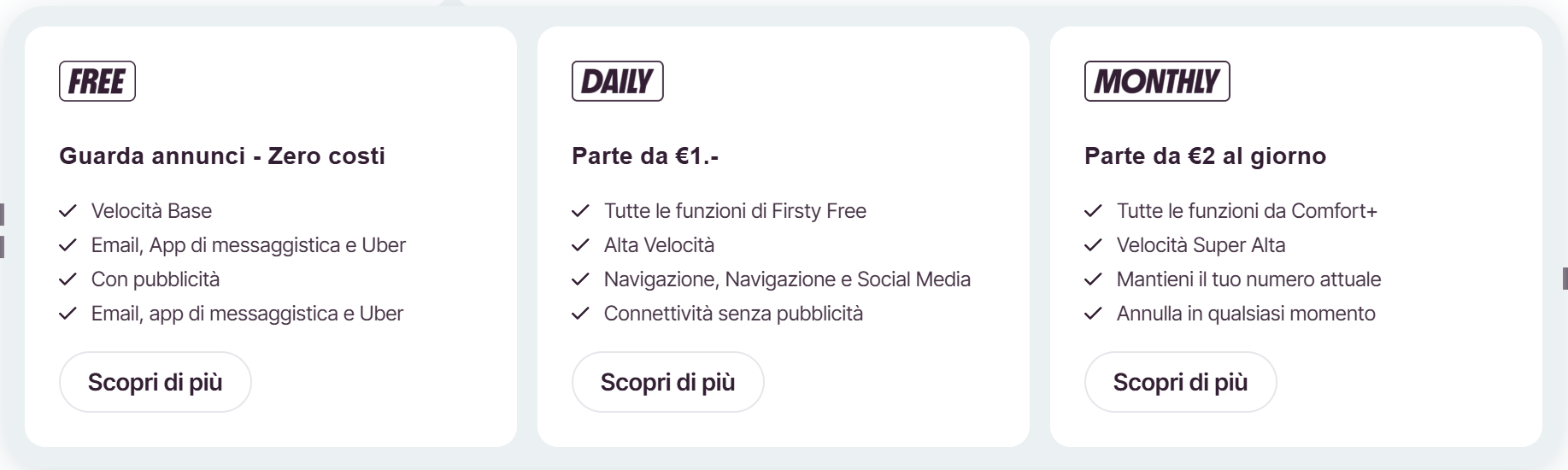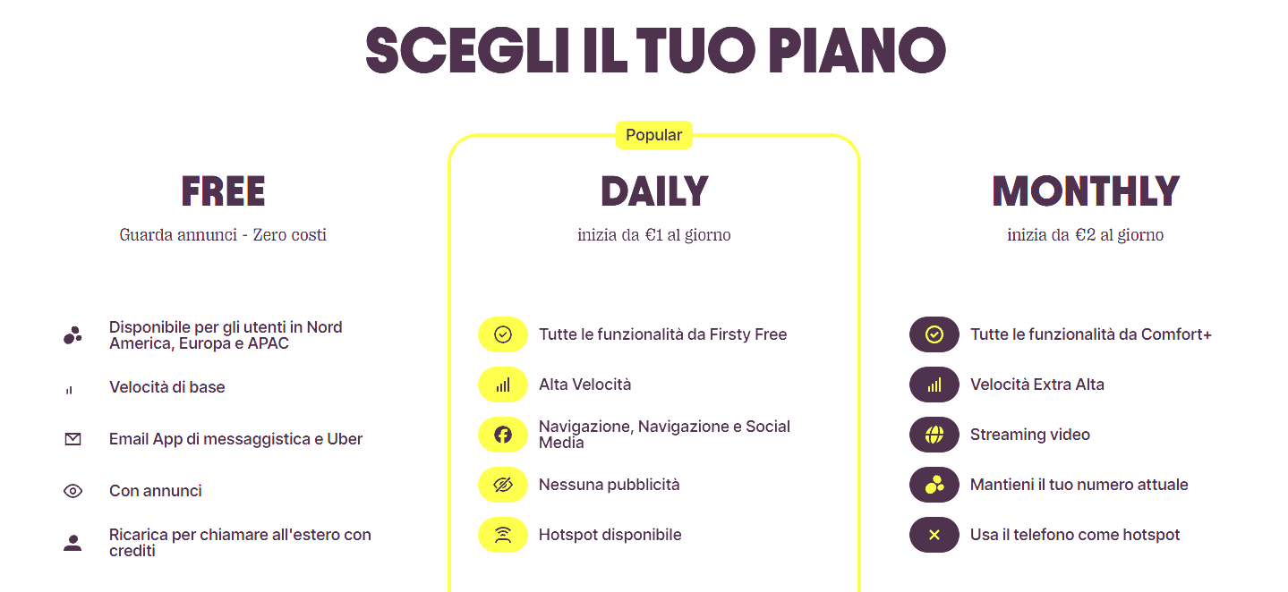La formula “FIRS CLASS” invece offre un’opzione a pagamento con un costo giornaliero di 3,00 €, ridotto in base al numero di giorni acquistati. Ad esempio, 30 giorni costano 60,00 € (2,00€/giorno). Ogni giorno acquistato include 5GB di navigazione alla massima velocità, incluso il 5G, senza pubblicità. Una volta terminato il bundle giornaliero, la connessione rimane illimitata ma si abbassa a 512Kbps.